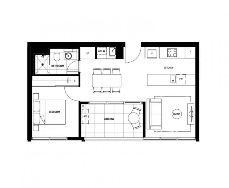 The apartment features a clever square-shaped floorplan with no wasted space, ensuring functionality and privacy. The open living and dining area is bright and versatile, with easy flow throughout the home.